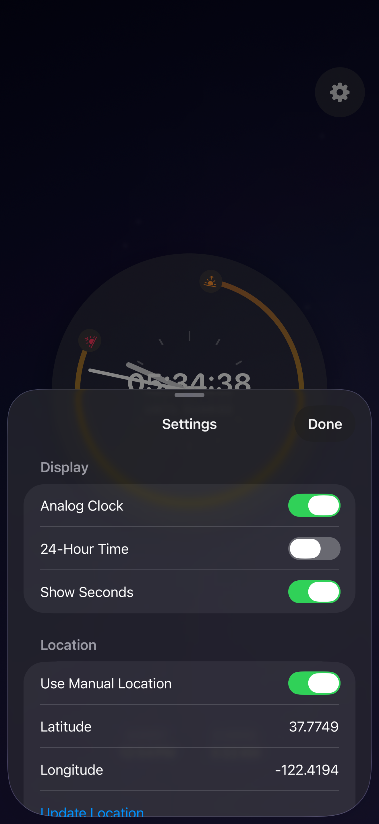 - Real-time countdown to sunrise and sunset with beautiful analog clock display